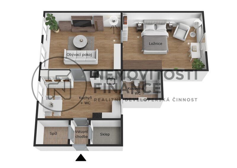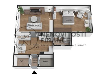 kuchyní, obývacím pokojem, ložnicí, koupelnou s WC, sklepem a spíží.