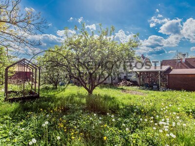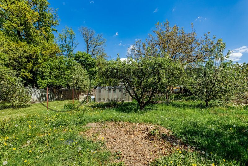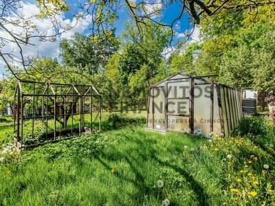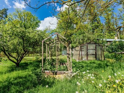 o oplocený pozemek se zděným zahradním domkem, skleníkem a dřevěným